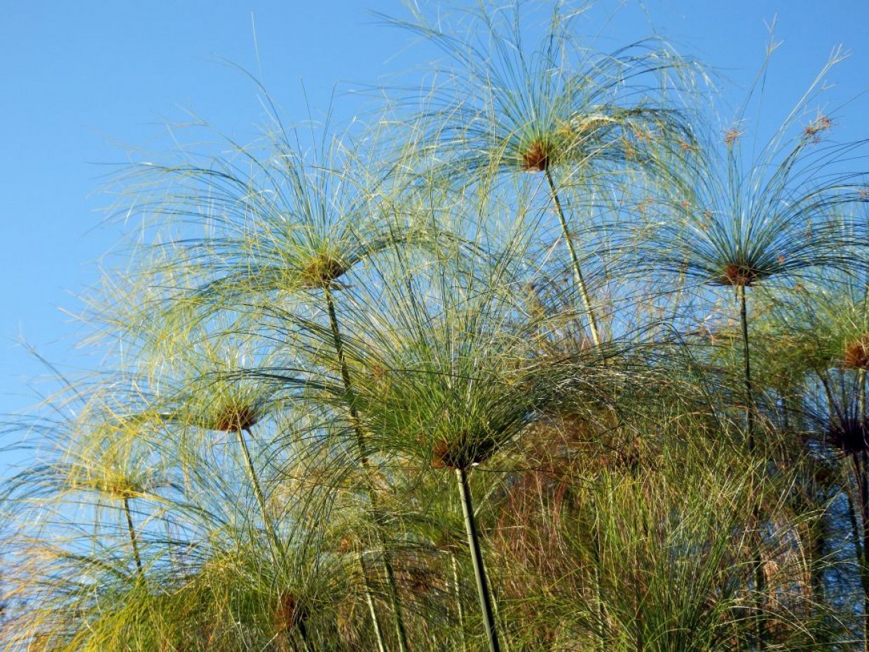 Toen wij hier het park op La Palma net gekocht hadden, was één van de eerste klussen het leeg maken van de grote vijver voor het voormalig restaurant, ons huidige huis. Die waterplanten waren wel drie tot vier meter hoog. Hun wortels hadden tot een meter hoog vrijwel de hele vijver overwoekerd. Bij nader inzien bleek deze plant de originele papyrus plant te zijn. Wij hebben voorheen, net als waarschijnlijk veel andere mensen, de paraplu plant ten onrechte als papyrus beschouwd. De paraplu plant, is wel familie van het Papyrus riet, maar heet Cyperus alternifolius. Dit echte papyrus riet (Cyperus papyrus) komt oorspronkelijk uit de Nijldelta in Egypte bij Alexandrië. Maar daar is het door de overbevolking en vervuiling grotendeels verdwenen. In andere gebieden in (sub) tropisch Afrika, zoals bijvoorbeeld Soedaan en Oeganda doet het Papyrus riet het bijzonder goed. Daar zijn reusachtige moerassen die vrijwel alleen maar met deze planten zijn bedekt. Op sommige plaatsen is het een ware plaag, zoals toen in onze grote vijver voor het restaurant. In het oude Egypte werd het papyrus riet gebruikt voor vele doeleinden. De jonge scheuten werden gegeten en het werd o.a. gebruikt in de bouw als dakbedekking. Het bekendst is natuurlijk dat de uitgerolde driehoekige stengels als papier werden gebruikt. Een ander belangrijke toepassing was het bouwen van bootjes van papyrus. De Noorse avonturier en schrijver Thor Heierdahl is in 1970 de Midelandse zee en de Atlantische Oceaan overgestoken van Egypte naar Barbados in een replica van een papyrusboot. Tegenwoordig hebben wij dit papyrus riet alleen nog maar in de grote vijver voor ons huis staan. In de vijvers bij de vakantiehuizen in de tuin hebben we de kleinere en makkelijker controleerbare parapluplant groeien. Het papyrus riet doet het overigens zeer goed als kamerplant zoalng de pot maar groot genoeg is en deze moerasplant voortdurend natte voeten heeft. Diverse van onze gasten hebben zaad meegenomen en hebben nu als een soort aandenken aan La Palma Papyrusriet in huis staan.